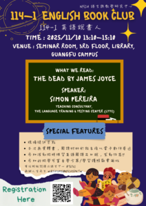 - 活動方式:每場約15-20人。每個場次由講師帶領討論一本指定書籍,欲參與同學可至自習中心報名並辦理書籍借閱。活動當天,參加者將在教師引導下,閱讀書籍,並參與討論書籍內容。參與活動者,現場提供下午茶,歡迎踴躍參加,共度美好的英語閱讀、討論與午茶時間。