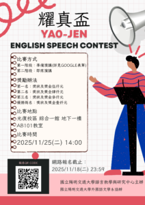 七、裁判:本校主辦單位語言教學與研究中心教師兩名(一名英語母語人士)、外文系教師兩名。